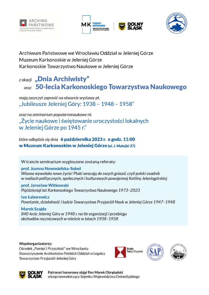 Archiwum Państwowe we Wrocławiu Oddział w Jeleniej Górze, Muzeum Karkonoskie w Jeleniej Górze oraz Karkonoskie Towarzystwo Naukowe w Jeleniej Górze z okazji „Dnia Archiwisty” oraz 50-lecia Karkonoskiego Towarzystwa Naukowego zapraszają na otwarcie wystawy pt. „Jubileusze Jeleniej Góry: 1938 – 1948 – 1958” oraz na seminarium popularnonaukowe nt. „Życie naukowe i świętowanie uroczystości lokalnych w Jeleniej Górze po 1945 r.”, które odbędzie się dnia 6 października 2023 r. o godz. 11:00 w Muzeum Karkonoski w Jeleniej Górze (ul. J. Matejki 27).