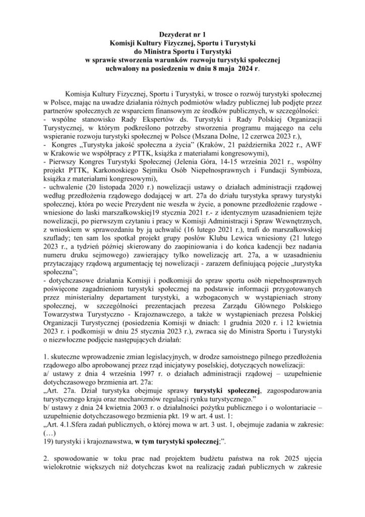 Prezentujemy poniżej z trudem wypracowane stanowisko sejmowej Komisji Kultury Fizycznej, Sportu i Turystyki, które jest konsekwencją naszych licznych wystąpień i ma docelowo doprowadzić do próby zbilansowania nakładów na kulturę fizyczną, turystykę i sport.
